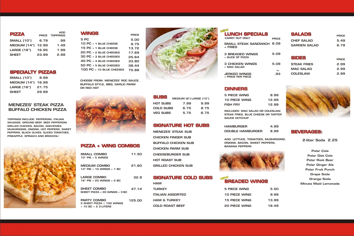 CHOOSE FROM: MENEZES' ROC SAUCE, BUFFALO STYLE, BBQ, GARLIC PARM OR RED HOT